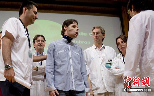 图为换脸者奥斯卡和他的医生们共同与媒体见面。