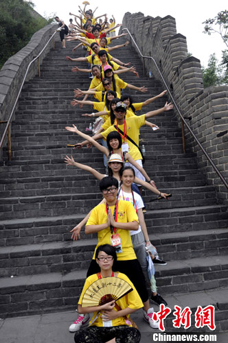 7月27日,2010年海外华裔及港澳台地区青少年“中国寻根之旅”夏令营部分营员来到长城游览。图为来自港澳台的部分青少年兴奋地在长城上摆起“千手观音”的造型留念。中新社发 刘震 摄