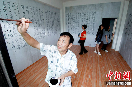 7月28日,福州闽侯民间书法家林孝荣在自家墙体上现场临摹唐朝草书大家怀素的《佛说四十二章经》,让人称叹。55岁的林孝荣从事建筑工程工作,并没有系统的学习过书法,完全凭着自己对草书字体的兴趣临摹唐朝草书大家张旭和怀素的狂草字而练得一手好书法。最让人称奇的是他都把字写在墙壁上,走进他家,五层楼一千多平方米的房子,到处墙壁都留下他的狂草字。林孝荣向记者表示,自己在墙上练字已经有五年左右时间,刚开始只是觉得好玩,后来便一发不可收拾,每天有空都要写上一两个小时,家里一千多平方米墙壁都写满后再用水泥漆全部重新刷过,然后再写,朋友称之“狂友”。