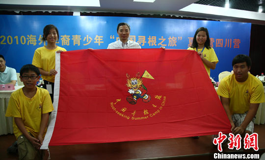 7月29日,“2010海外华裔青少年‘中国寻根之旅’夏令营四川营”在成都正式拉开帷幕,来自欧美大陆的170多位华裔青少年汇聚蓉城,寻根四川。图为四川省侨办主任周敏谦向营员授营旗。中新社发 张浪 摄