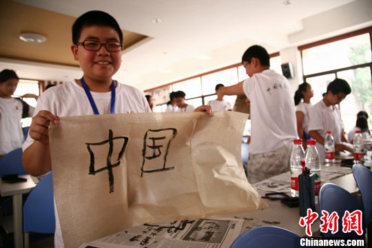 7月30日,参加“2010中国寻根之旅”四川营的170多位海外华裔青少年,在成都参加了学习中国书法和民族舞蹈。图为来自俄罗斯的陈威展示他所写的毛笔字“中国”。中新社发 张浪 摄