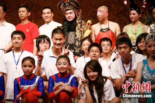 7月30日晚,参加“2010中国寻根之旅”四川营的170多位海外华裔青少年,在成都欣赏了川味十足的《俏花旦》、《皮金滚灯》、川剧吐火、变脸等节目。图为表演结束后华裔青少年和参加演出的演员合影。中新社发 张浪 摄