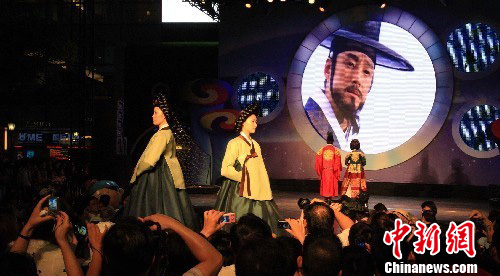 8月1日晚,2010新天地韩国文化旅游周之韩国服装秀在上海新天地南里广场举行。中新社发 潘索菲 摄