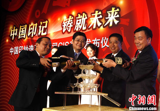 8月4日,中国印钞造币总公司在北京举行集团新CIS系统发布仪式。图为中国人民银行副行长马德伦(右二)、中国印钞造币总公司董事长敖惠诚(左二)等启动新标识发布仪式。中新社发 张宇 摄