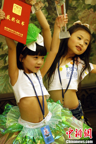 8月5日,2010新丝路中国少儿模特大赛总决赛颁奖典礼在北京人民大会堂举行,来自中国17个省市地区的500多名小模特参加了颁奖典礼,获奖组别分为儿童组、少儿组以及少年组。图为参赛获奖小模特展示风采。中新社发 钱兴强 摄
