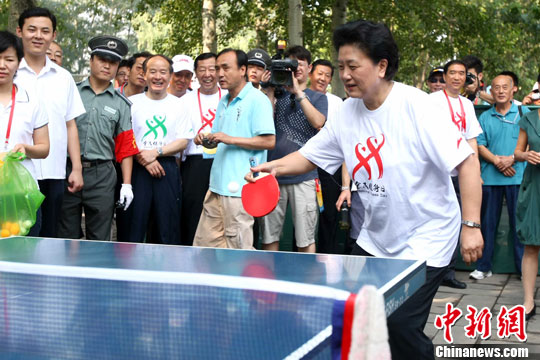 8月8日,是中国国务院批准设立的第二个全国“全民健身日”,今年活动的主题为“全民健身志愿服务大行动”。图为当日在北京朝阳公园举行的全民健身日活动中,中共中央政治局委员、国务委员刘延东(中)与民众打乒乓球。中新社发 富田 摄
