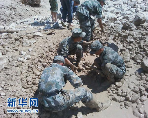 8月8日,兰州军区某集团军防化团官兵正在搜寻遇难者遗体。截至8日12时,甘肃省甘南藏族自治州舟曲县泥石流灾害遇难人数已上升至85人,另有70余人受伤。根据甘南州州长毛生武现场的电话介绍,形成堰塞体的泥石流掩埋了一个300余户群众的村庄。受强降雨造成的泥石流等灾害影响,甘肃省舟曲县超过三分之二的区域供电全部中断,通信基站受损严重。王彦军 摄