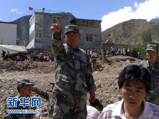 8月8日,兰州军区某集团军官兵和当地群众正在现场实施救援(手机照片)。