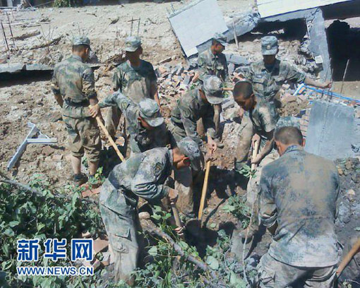 8月8日,兰州军区某集团军防化团官兵正在现场实施救援。王彦军 摄