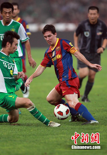 梅西头顶脚踢两中柱,45分钟征服鸟巢球迷。中新社发 杜洋 摄