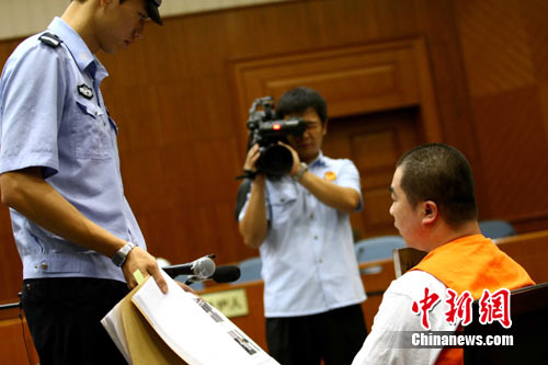 8月12日,北京大兴李磊灭门案在北京市第一中级人民法院公开审理。图为法警在向犯罪嫌疑人李磊(右)出示证据。中新社发 富田 摄