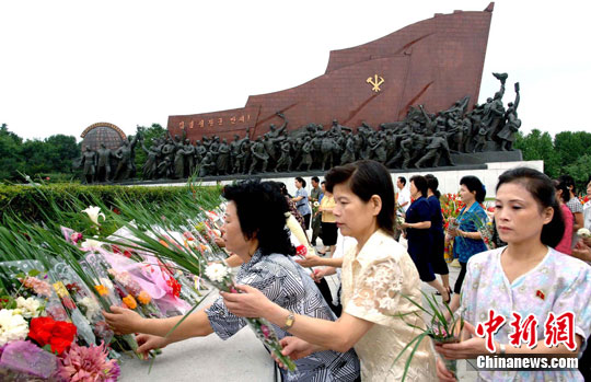 8月16日,朝鲜平壤,朝鲜民众在平壤金日成的雕塑前纪念解放日。