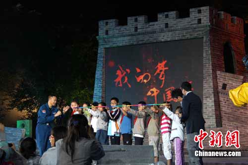 中国空军试飞英雄李中华在《开学第一课》中域孩子们做游戏。 张民 摄