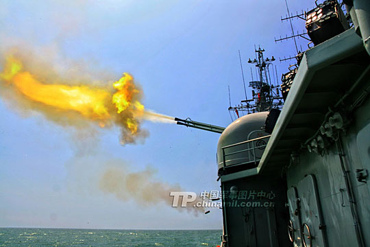 “目标左舷××度,高度××!”、“自动工作!”、“校对瞄点!”、“各战位瞄点准确!”、“伺机发射!”……8月15日,东海某海域风高浪急、烈日炎炎,随着副炮操作手对战机的准确把握,一串串炮弹瞬间呼啸而出,怒震海疆。这是东海舰队某护卫舰大队根据新大纲训练要求,紧贴实战,组织的一次复杂背景的实弹演练。