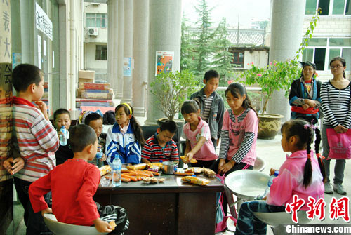 8月26日,中华少年儿童慈善救助基金会在舟曲举办灾区孤儿赴京休养启程仪式。12名在舟曲泥石流灾害中失去亲人的孤儿启程赴北京休养。图为出发前,孩子们在一起吃早餐。中新社记者 侯志红摄
