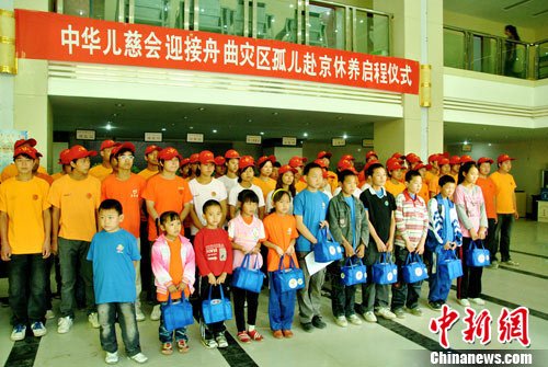 8月26日,中华少年儿童慈善救助基金会在舟曲举办灾区孤儿赴京休养启程仪式。12名在舟曲泥石流灾害中失去亲人的孤儿启程赴北京休养。中新社记者 侯志红摄