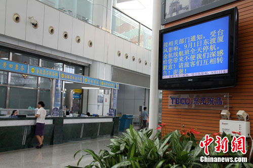 9月1日,受今年第6号热带风暴“狮子山”影响,厦金航线全线停航,厦金客运大厅向旅客发出停运信息。据气象部门预计,“狮子山”可能于1日下半夜到2日上午在福建晋江到广东汕尾之间沿海登陆。中新社发 朱兴鑫 摄