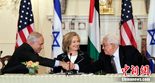 9月2日,在位于首都华盛顿的美国国务院,以色列总理内塔尼亚胡、美国国务卿希拉里·克林顿、巴勒斯坦民族权力机构主席阿巴斯(从左到右)出席巴以直接会谈重启仪式。