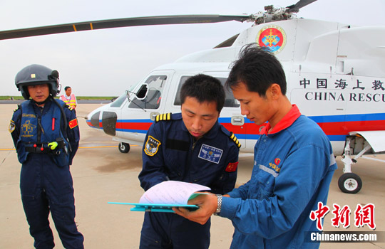9月7日晚,东营胜利油田3号平台发生45度倾斜,2人落水34人受困,交通部组织直升机和船只营救。图为交通部第一救助飞行大队的救援人员完成任务后,在东营机场加油、交接救援工作情况,准备返航。中新社发 钟新 摄
