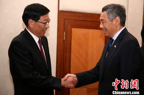 9月9日晚间,湖南省代省长徐守盛(左)在长沙会见了正在湖南访问的新加坡总理李显龙。据悉,李显龙一行于8日抵达长沙,开始对湖南进行访问,实地感受湖湘文化的博大精深,并深入考察文化、旅游、工程机械等产业发展情况。中新社记者 白祖偕 摄