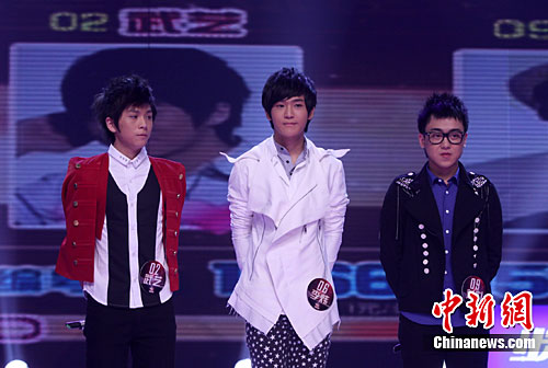 2010年“快乐男声”9月11日凌晨正式落幕,在近5个小时的激烈比拼中,来自广州唱区的“实力偶像”李炜(中)终凭不凡唱功夺冠,一直以原创见长的刘心(右)位列亚军,人气王武艺虽然进步迅猛备受好评,但在前三轮比赛后就以大比分不敌刘心而成为第三名。中新社记者 邓霞 摄