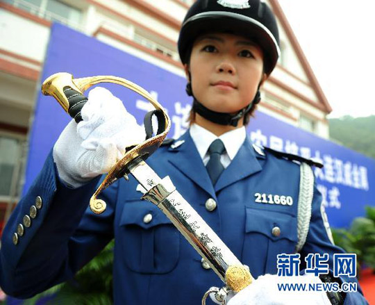 9月16日,一名女骑警在大连女子骑警基地展示新马刀。当日,大连女子骑警大队获赠60把执勤、表演用骑警马刀。这批新式马刀外形简洁流畅,图案搭配精巧,可充分展现女骑警的英姿。李钢 摄