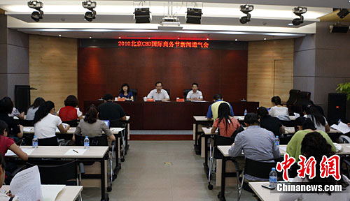 九月十六日,2010北京CBD国际商务节在北京举行新闻发布会宣布:第十一届国际商务节将于十月二十八日至十一月七日在北京最高地标建筑——国贸三期举行。世界CBD联盟2010年度峰会也将首次亮相此次商务节。历经十年的北京CBD目前已经成绩卓著。中新社记者 任海霞 摄