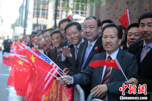 图:温家宝抵达纽约 三千华人华侨夹道欢迎
