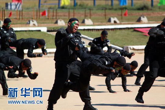 9月23日,特警队员进行格斗对抗表演。赵琬微 摄