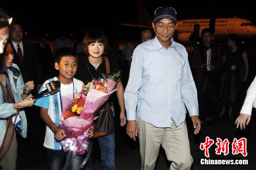 9月25日4时,被日方非法抓扣的中国渔船船长詹其雄(右)乘中国政府包机安全返抵福州。 中新社记者 王东明 摄