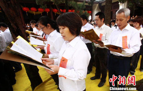 9月28日,千余名海内外儒学专家、孔子学院代表、教师、学生和市民代表再次汇集在浙江省衢州市孔氏南宗家庙的大成殿前,祭祀先圣孔子。衢州的祭孔大典定位于“当代人祭孔”,即以当代人的礼仪祭祀孔子。整个祭孔典礼共分“祭礼”和“颂礼”两个部分,安排了向孔子像鞠躬、敬献花篮,由主祭人进香、敬酒和诵《祭孔子文》等环节,并邀请市民的代表上台颂读了《论语》章句。图为衢州市民代表在诵《祭孔子文》。
