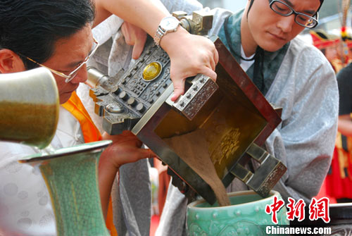 9月28日上午,广西柳州文庙举行重建后的首次祭孔大典。图为祭孔大典上将圣土圣水与柳江的水、柳州的土进行融合。 中新社发 周潇男 摄