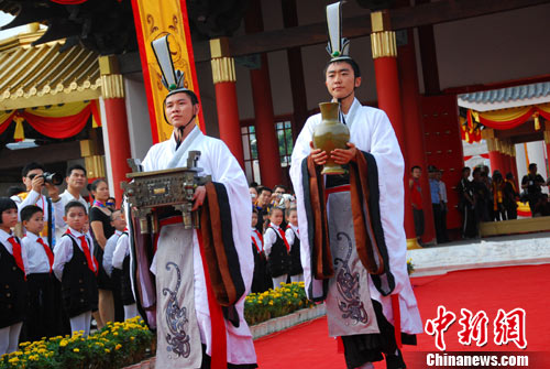 9月28日上午,广西柳州文庙举行重建后的首次祭孔大典。图为恭送圣土圣水。 中新社发 周潇男 摄