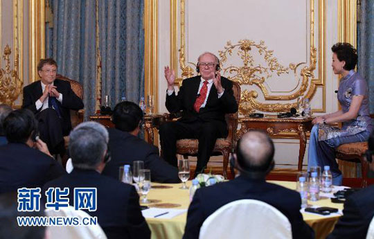 9月29日晚,比尔·盖茨和沃伦·巴菲特在北京与商界、慈善界人士会面交流,就慈善事业发展这一话题进行深入探讨。庞兴雷 摄