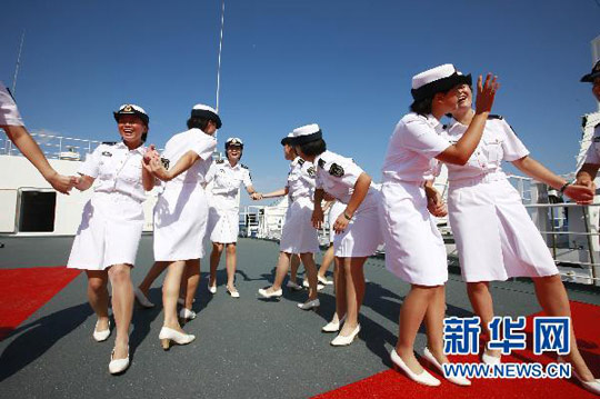 9月30日,在亚丁湾的中国海军“和平方舟”号医院船上,女水兵们载歌载舞庆祝新中国生日。 查春明 摄