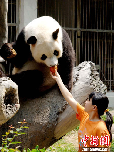 10月7日,福州大熊猫正在享受饲养员送到嘴边的苹果。国庆黄金周期间,福州熊猫世界成为小孩最热衷去的地方,大熊猫在享受完各种美食后,也给前来观看他们的游客上演各种节目。