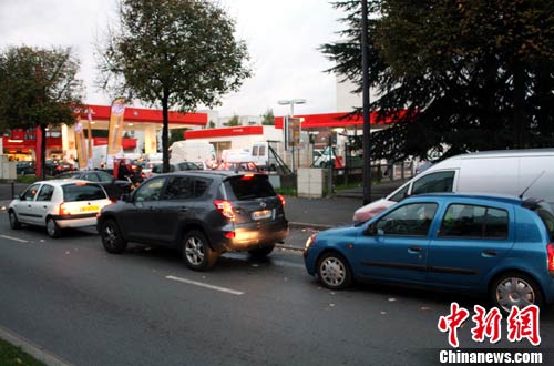 10月19日是法国各大工会发起的近七周来第六个反退休改革全国罢工示威日,加剧了因连日罢工出现的加油站油料短缺的状况及民众的恐慌心理。图为当日天刚蒙蒙亮,巴黎近郊一座加油站前就排起加油车的长龙,空油桶更是已被抢购一空。