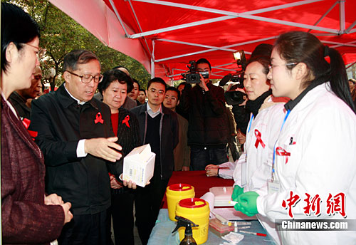 中新网11月27日电:湖北省暨武汉市“世界艾滋病日”宣传咨询活动在武汉举行。活动当天,前来参观的市民络绎不绝。文艺演出、图片展览。医务人员现场解答市民对预防艾滋病的咨询、为市民做检测。当日湖北省省长李鸿忠、省委常委副省长张岱梨来到现场,询问医务工作者宣传咨询活动情况。