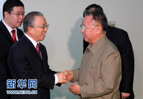 12月9日,朝鲜劳动党总书记、国防委员会委员长金正日(前右)在平壤会见了中国国务委员戴秉国(前左)。双方就中朝关系和半岛局势进行了坦诚、深入的谈话,达成重要共识。戴秉国应邀于12月8日至9日访问朝鲜。访问期间,戴秉国同朝鲜内阁副总理姜锡柱举行会谈。