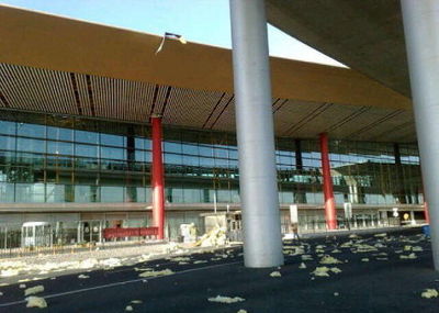 12月10日,北京遭遇大风天气,首都机场地区最大风力高达10级,T3航站楼西侧局部金属板被强风掀开,白色材料卷入风中,飘洒在周边跑道和车道上。事发后,机场方工程人员赶到现场抢修。受强风影响,首都机场共延误航班200余架次。