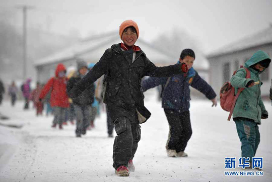 在宁夏固原市西吉县偏城乡,小学生在放学路后冒雪行进(12月24日摄)。自23日下午开始至24日白天,宁夏大部分地区迎来今冬首场降雪,过程降温8摄氏度左右。据了解,此次降雪有利于降低森林火险等级和土壤保墒。王鹏 摄