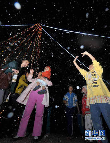 12月24日,市民和游客兴奋地在“雪花”中嬉戏。当日是平安夜,海口市白沙门公园内的飘雪装置吹起纷纷扬扬的雪花,让市民和游客体验到了浓浓的北国风情。郭程 摄