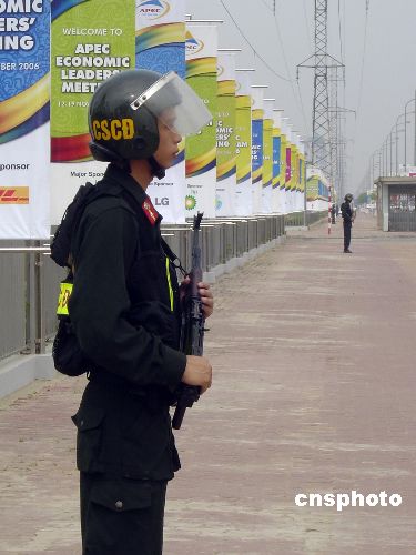 APEC第14次领导人非正式会议将于11月17日至19日在越南举行,主会场——越南国家会议中心外戒备森严,每隔几十米便有一名荷枪实弹的警卫。中新社发 于晶波 摄