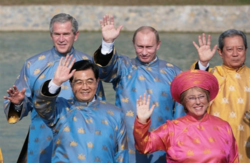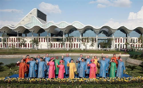 APEC“大家庭”一年一次的“全家福”合影每每是峰会上最抢眼的风景。今天下午,二十一个成员体领导人或代表身着越南最具传统的民族服饰“奥黛”,一字排开,在APEC主会场——越南国家会议中心的背景映衬下,展颜微笑,蜂拥而至的记者用镜头记录下了这一历史瞬间。