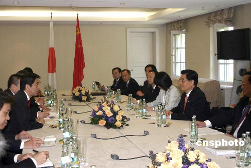 国家主席胡锦涛六月八日在德国海利根达姆出席八国集团和发展中国家领导人对话会后,会见了日本首相安倍晋三,双方就双边关系和共同关心的问题交换了意见。中新社发 王岩 摄