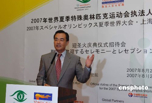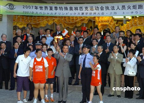 8月22日晚,“2007世界夏季特殊奥林匹克运动会执法人员火炬跑”仪式在中国驻日大使馆举行。中新社发 滕剑峰 摄