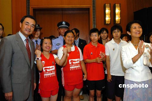 8月22日晚,中国驻日使馆为祝贺2007世界夏季特殊奥林匹克运动会执法人员火炬跑日本段圆满成功举行举办庆典招待会。图为中国驻日大使王毅、日本皇室成员高圆宫妃殿下与中日两国特奥运动员在招待会上。中新社发 滕剑峰 摄
