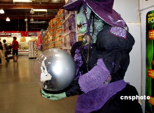 美国玩具业因检查中国货费时费钱而成本上升,本来应该红火的年终市场被迫涨价一成以上,结果转嫁给消费者。图为洛杉矶九月的超级市场,已经摆上中国制造的万圣节鬼怪玩具。中新社发 贾国荣 摄