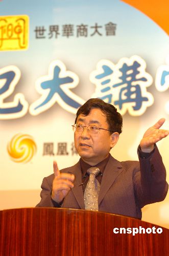 9月16日上午,中国著名学者余秋雨做客凤凰卫视世纪大讲堂的世界华商大会现场,与在场世界华商探讨中国文化与世界华商。图为余秋雨正在进行演讲。中新社发 滕剑峰 摄