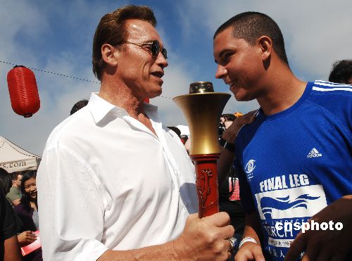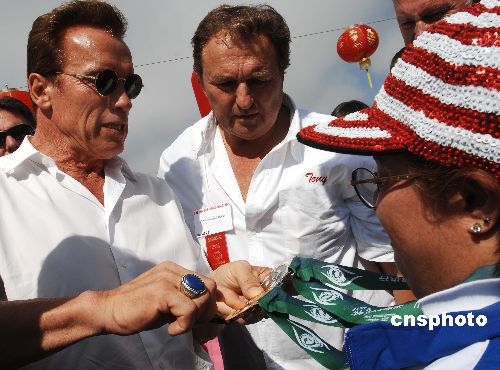 当地时间十月十四,美国南加州最美丽的圣塔莫尼卡码头命名为“上海滩”,各界来宾与欢迎六位特殊奥运会选手荣获九枚奖牌从上海凯旋,曾亲赴上海特奥会的加州州长施瓦辛格赴会助兴。中新社发 贾国荣 摄